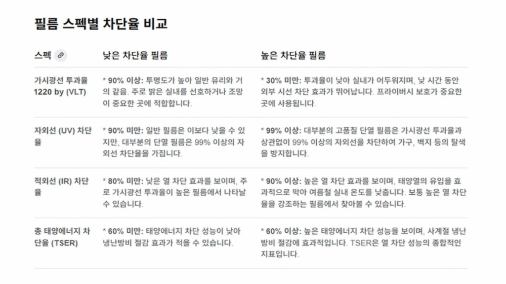 수치만 볼 땐 VLT·SHGC·IRR을 세트로 비교하세요. 밝기만 높고 SHGC가 높은 제품은 겨울·여름 모두 체감이 약합니다. 반대로 너무 어두운 VLT는 야간 시야·피로도가 늘 수 있어요.